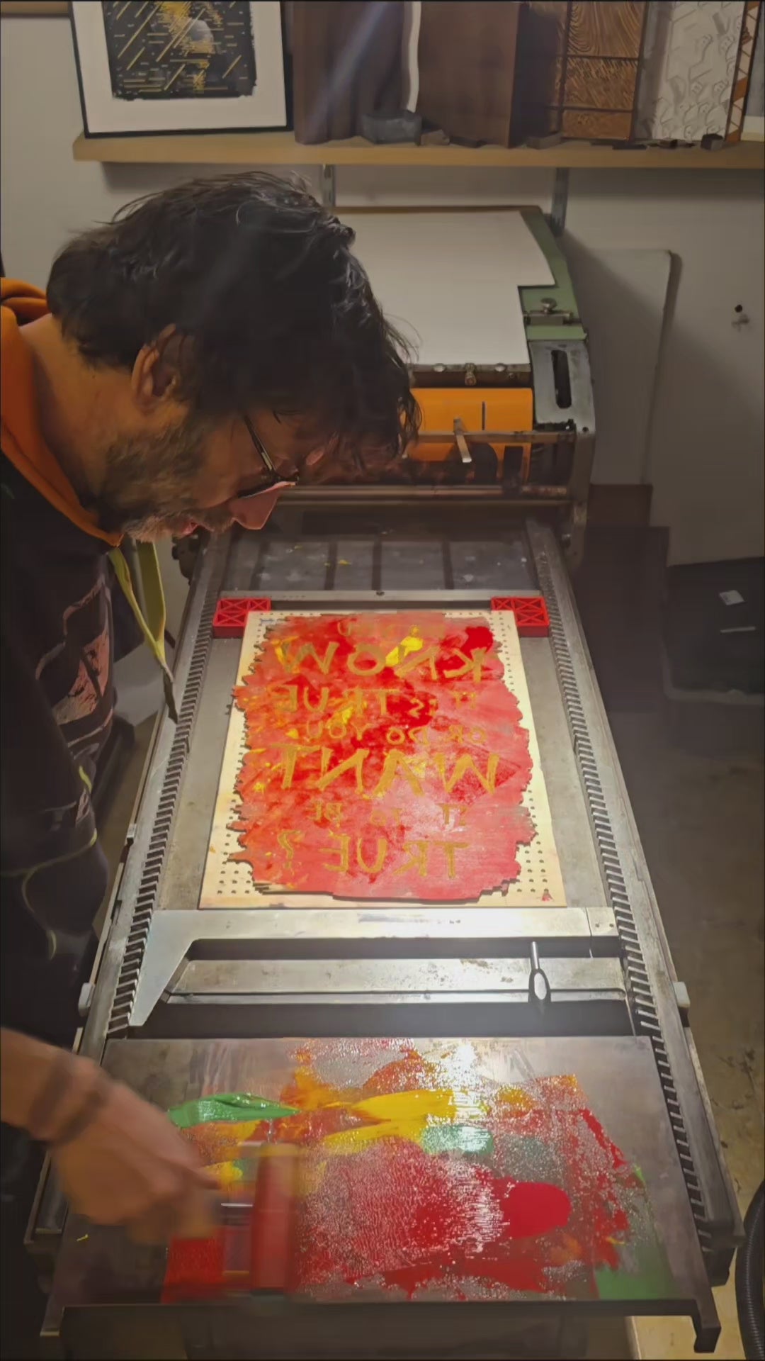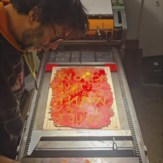 Door het handmatige proces is geen enkele print identiek. Lichte variaties in kleurintensiteit, inkt-overlopen en drukverdeling zijn inherent aan de techniek en maken elk werk tot een origineel.