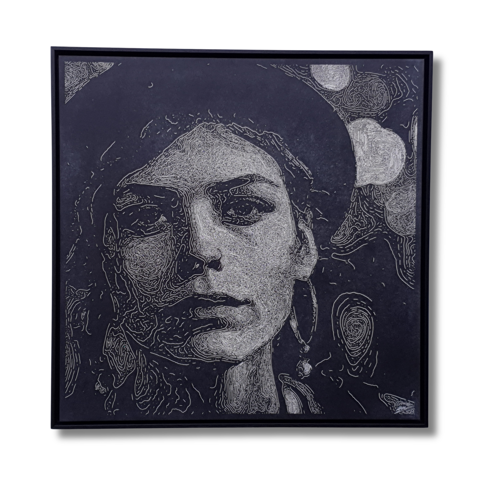 Met behulp van kunstmatige intelligentie worden portretten gegenereerd, die door de kunstenaar worden vertaald naar gedetailleerde lijntekeningen. Vervolgens worden deze lijnen met een laser in hout gegraveerd en met de hand gevuld met olieverf. Deze combinatie van houtgravure en olieverf creëert een uniek effect. Van dichtbij ontvouwt zich een wirwar van abstracte lijnen en patronen, een bijna chaotische weerspiegeling van de complexe algoritmen achter AI. Van een afstand smelten deze abstracties samen tot een fotorealistisch portret. Deze techniek speelt met de spanning tussen detail en overzicht, tussen het digitale en het tastbare, en nodigt uit om vanuit verschillende perspectieven en afstanden te kijken. Dit verrijkt de ervaring en onthult telkens nieuwe lagen van betekenis.