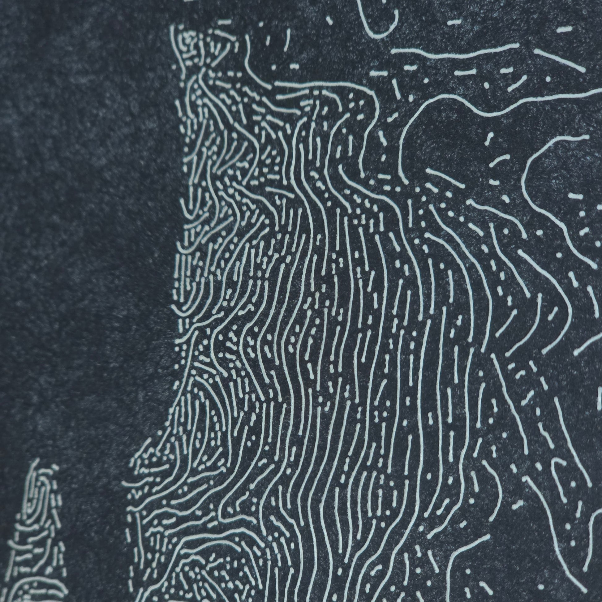 Deze combinatie van houtgravure en olieverf creëert een uniek effect: van dichtbij ontvouwt zich een wirwar van abstracte lijnen en patronen, terwijl de vormen van een afstand samensmelten tot een fotorealistisch beeld. De techniek speelt met de spanning tussen detail en overzicht, tussen het digitale en het tastbare, en nodigt uit om het werk vanuit verschillende perspectieven te bekijken. Hierdoor wordt de ervaring verrijkt en komen telkens nieuwe lagen van betekenis aan het licht.